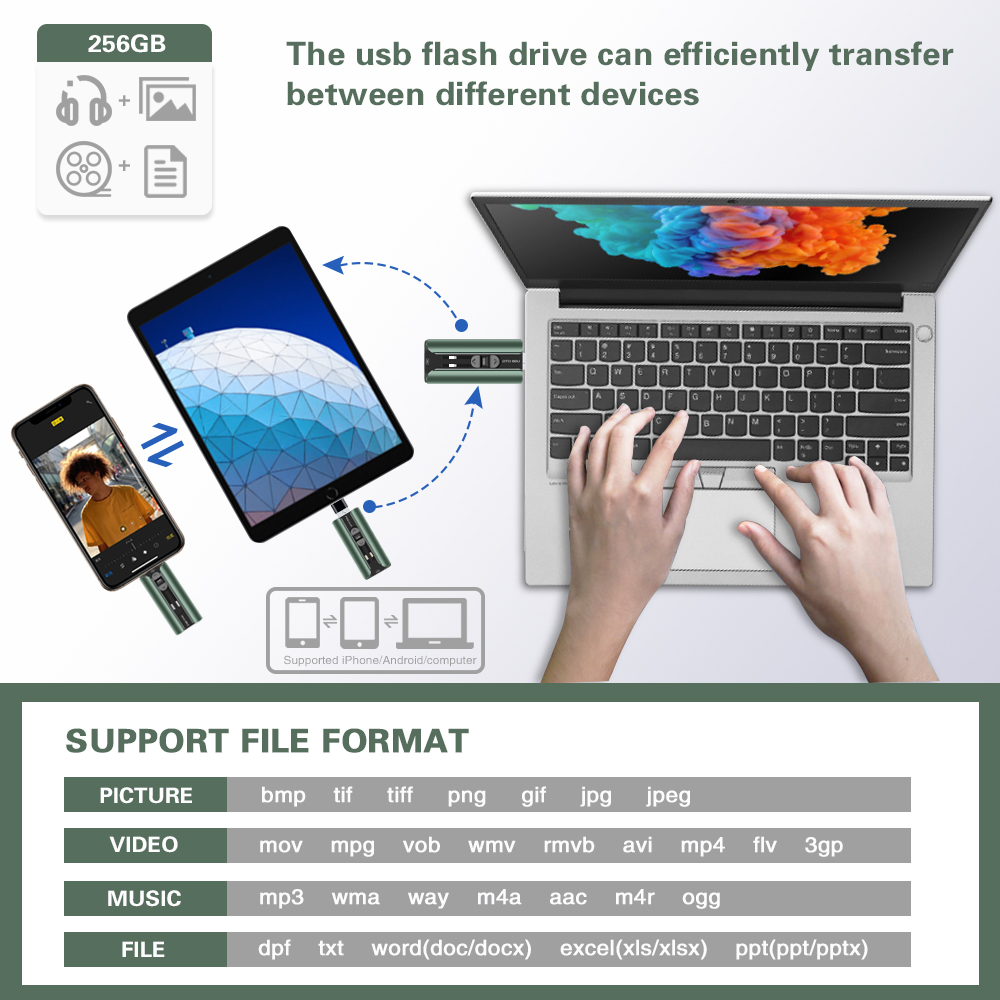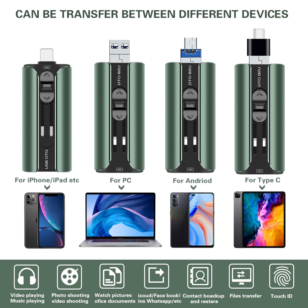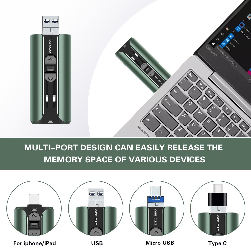 • ·Multi-Port usb drive:The usb stick with usb/iphone connection port/micro usb/type c (independent adapter) four interfaces,which is more convenient for data transfer between different devices, so as to get rid of the data cable and iTunes and iCloud, let you switch easily storage space.
