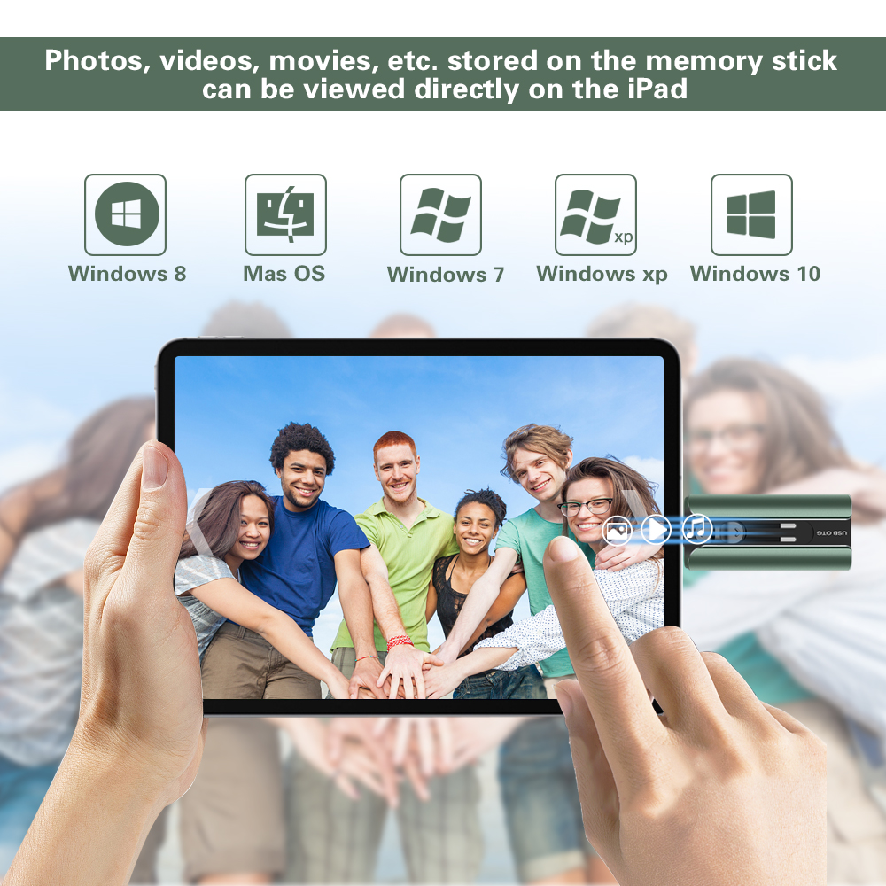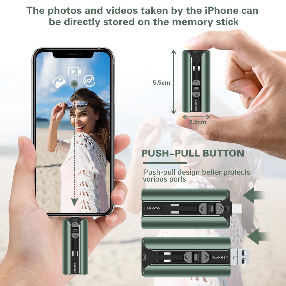 • ·One-Click Backup:The jump drive plug and play, you can back up multiple files such as videos/pictures/documents with one click,No more cumbersome paste copying,Save you more time.When the photo stick is plugged into the iPhone/iPad/Android etc, you can directly store the video and photos you have taken on the flash drives without occupying the device memory.
