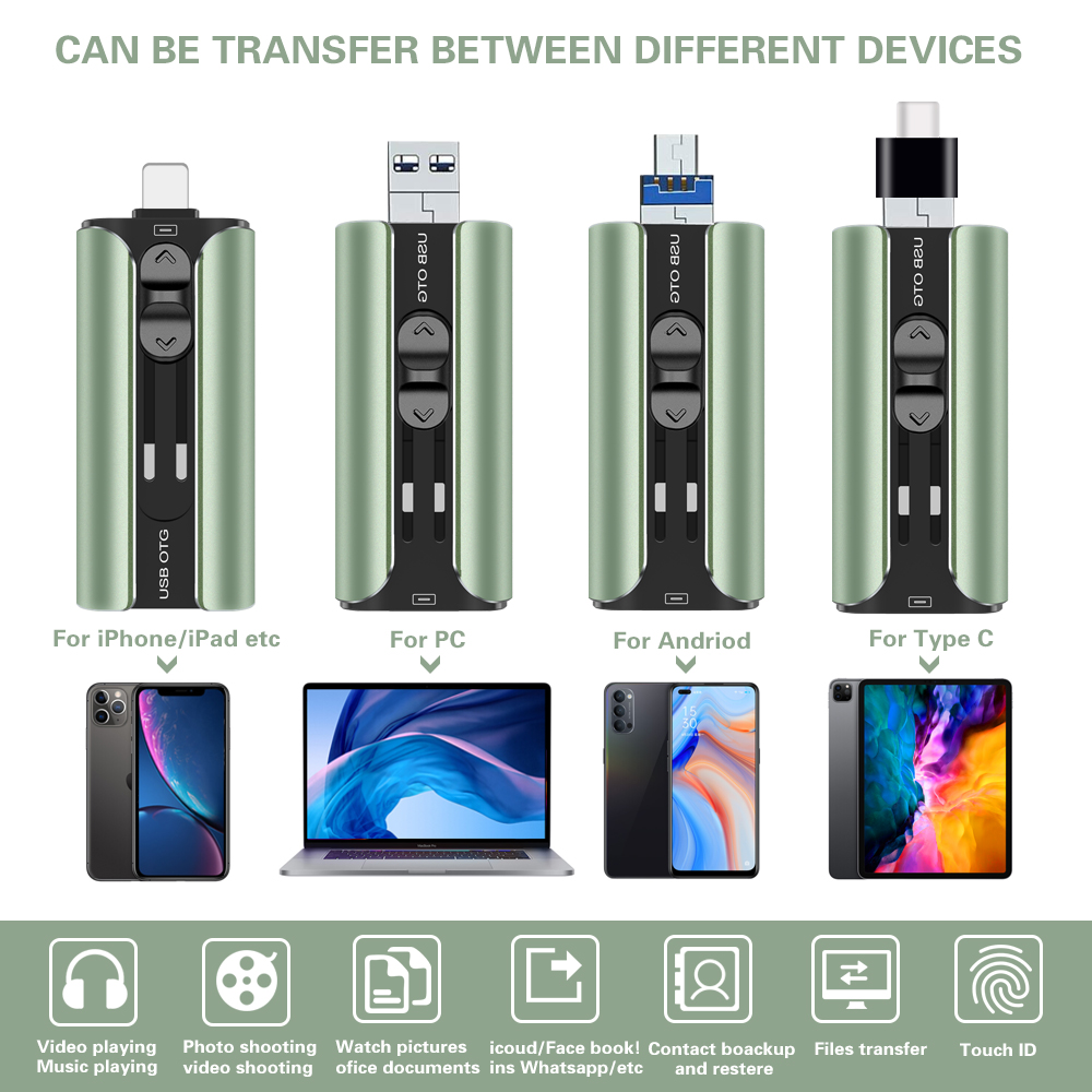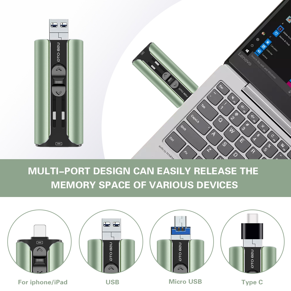 ·Multi-Port usb drive:The usb stick with usb/iphone connection port/micro usb/type c (independent adapter) four interfaces,which is more convenient for data transfer between different devices, so as to get rid of the data cable and iTunes and iCloud, let you switch easily storage space.